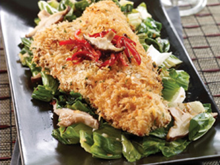 Thin layer of mayo cover top in panko parm cheese and lemon zest. Serve with grilled vegetables and a sprinkle of chopped. Quickly slather over mayo and a sprinkling of parm.